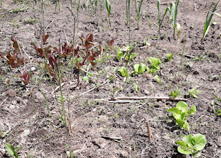 2. Lettuce has reseeded itself from last year's crop. This needs to be inspected every day and overcrowding dealt with by judicious harvesting. Don't buy baby greens from the grocery store... take those thinned out babies into the house, rinse them off and store them in damp paper towels in the fridge. Eat later with a light salad dressing. Yum.